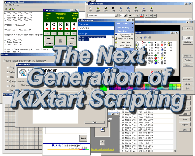 This web site is dedicated to KiXforms, the most powerful graphical plug-in for the popular KiXtart scripting language. I would very much appreciate your suggestions and comments via the online feedback form. Finally, please note that this site has been designed specifically for modern browsers that adhere to open standards. If you are running a version of Internet Explorer prior to v5.x, or Netscape Navigator prior to v6.x, then I suggest you upgrade if at all possible. This site may not display or function as intended on outdated browsers.